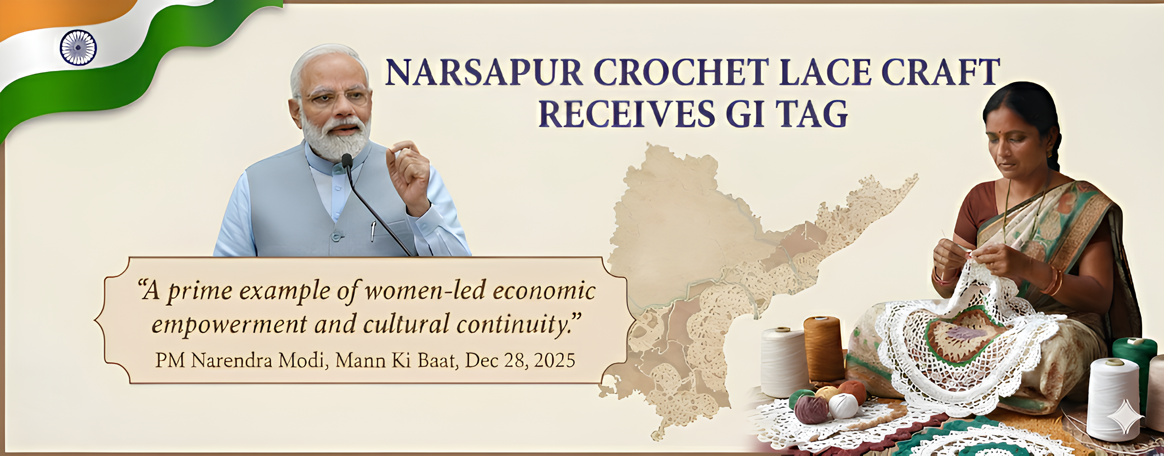"Narsapuram Crochet Lace is a prime example of women-led economic empowerment and cultural continuity." > — PM Narendra Modi, Mann Ki Baat (December 28, 2025)